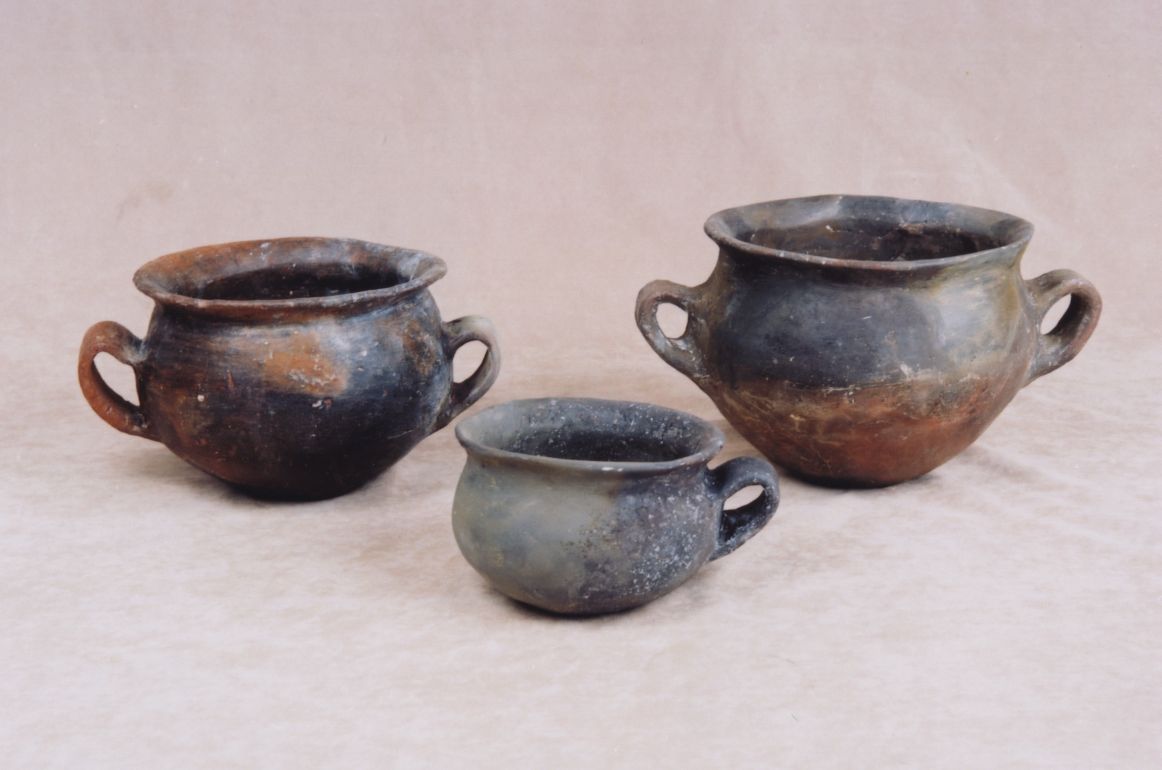 two-handled bowls (kraters), pedestal-footed cups, cooking pots,