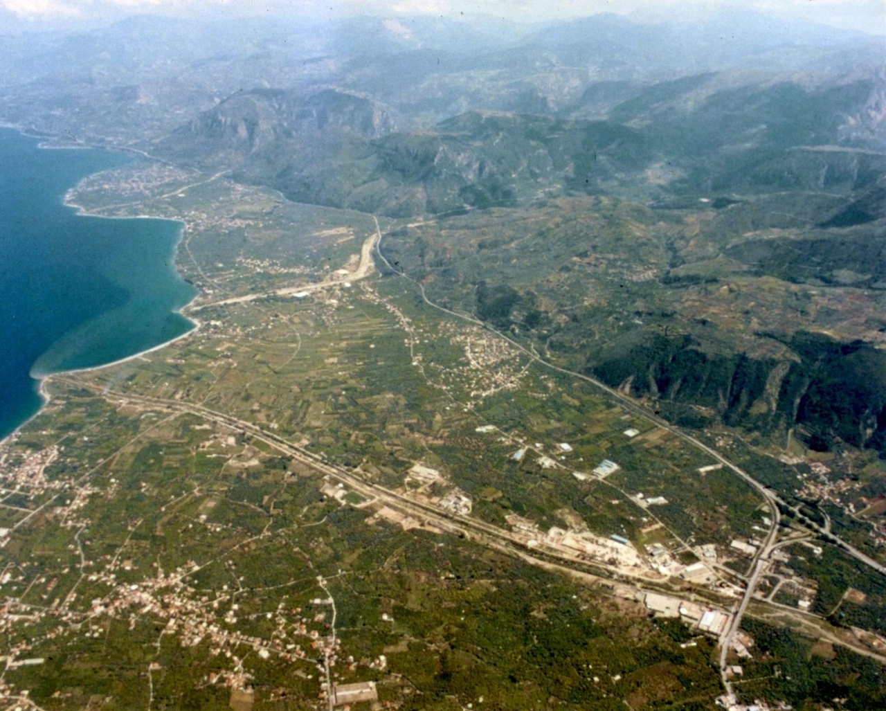 Delta, viewed toward the southeast, with the Gulf of Corinth at